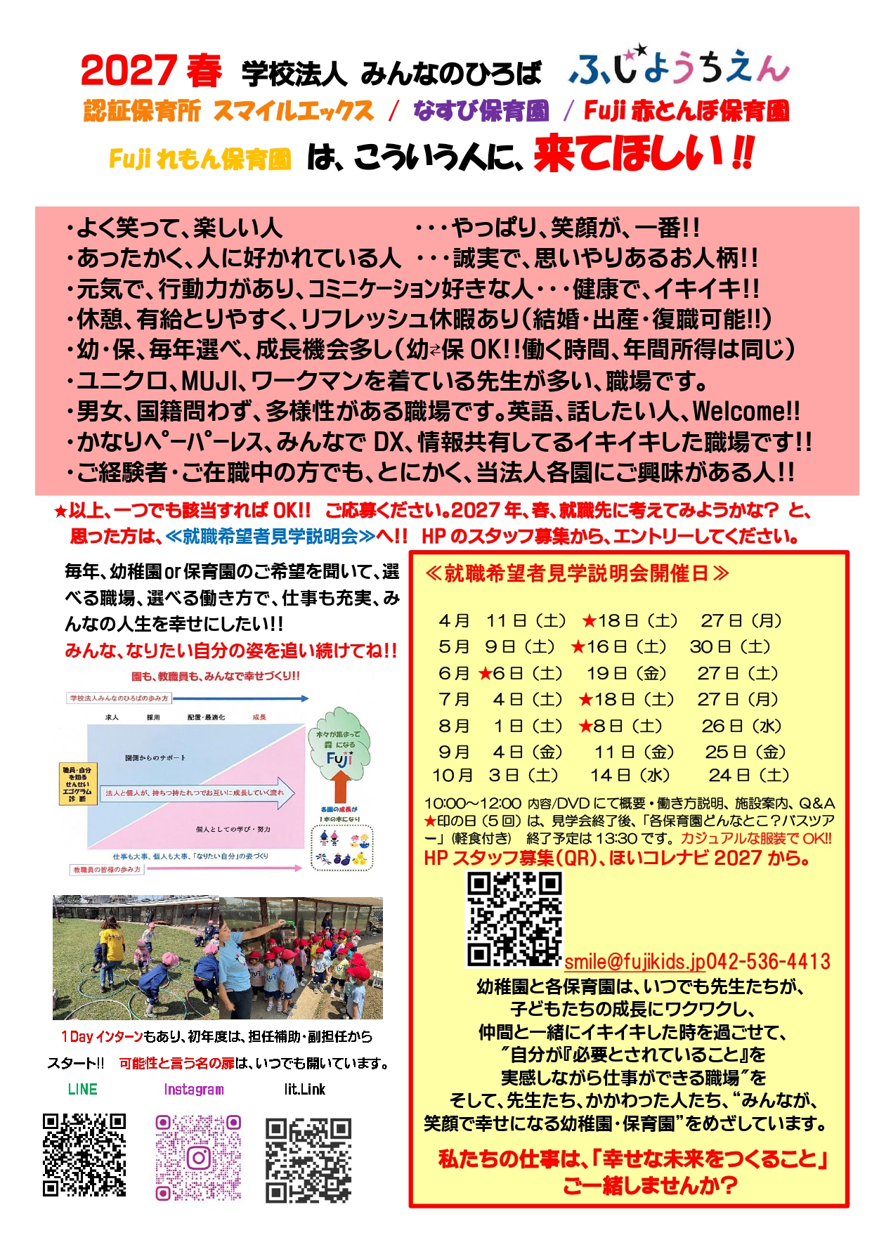 説明会の内容:カジュアルな服装(私服)でご参加ください。園の概要・働き方、1日、1年流れなどのご説明と施設案内をいたします。最後に質疑応答を予定しております。